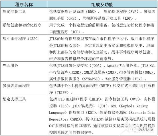 联合战区级模拟系统(JTLS)为构造仿真系统,通过六类模型提供兵力控制、地面作战、空战、海战、后勤保障以及指挥、控制、通信和情报(C3I)作战模拟功能。
