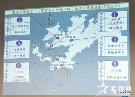 据台媒体报道,在2017年5月举行的“汉光33”联合兵棋推演中也使用了JTLS,该次军演以2025年大陆军力状态进攻台湾作为想定,开展了五天四夜24小时不间断的兵棋推演,军演的重点包括战力保存、联合情报、监视与侦察运用、联合反封锁及联合反登陆作战等项目(图5)。这次演习设定了大陆在2025年3艘航母建置成军并建成隐形战机以及新型导弹,相关战术战法还模拟了台军是否买到F-35的情形下该如何作战。
