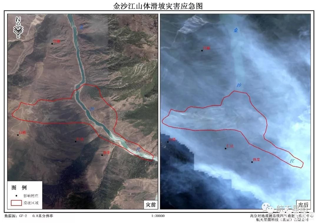 航天星图迅速成立任务突击小组,在高分四川中心的领导下,开展《金沙江山体滑坡灾害应急图》等系列应急专题图制作工作。任务突击小组快速获取了灾害次日(2018年10月12日)高分辨率遥感影像,利用GEOVIS iData产品丰富的多源数据,使用GEOVIS iFactory产品实现了灾害区域正射影像的快速生产,采用先进的人工智能识别技术,通过遥感地物解译、变化检测、空间分析等手段,完成了灾害区空间位置、滑坡体方量、影响范围、成因分析、趋势预测分析等重要信息提取。在高分四川中心的指导下,制作完成了救援抗灾遥感监测专题图,相关成果第一时间提交应急救援前线相关部门。