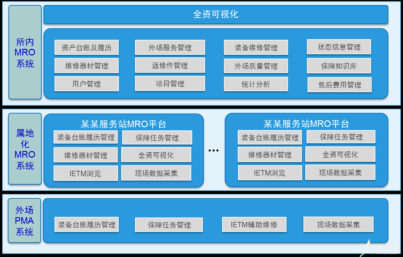 在全所保障信息化的统一规划下,通过构建所本部保障中心MRO系统为主导,实现面向全所交付装备综合保障的规划和售后服务;以属地化MRO系统为骨干,实现面向服务站装备的靠前保障实施和信息反馈;以PMA(现场作业管理)系统为支撑,实现面向交付装备的现场任务执行过程记录、现场维修指导和现场数据采集;从而形成覆盖全所交付装备,贯穿所内、服务站、PMA三级体系的装备全寿期售后服务管理系统布局。