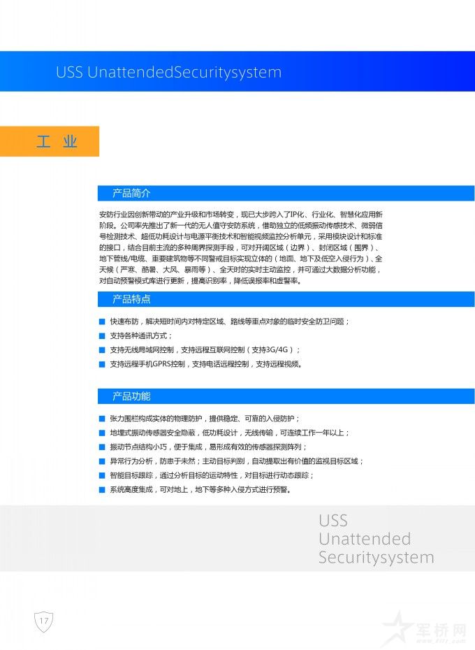本文包含了对USS-T张力围栏入侵探测系统,USS-V无人值守系统·振动和USS-I无人值守系统·智能视频监控的产品参数、应用案例和特点的介绍了;也讲述了USS无人值守安防系统的原理。通过对USS无人值守安防系统组成的分析说明了其特点与优势,进行了USS的数据统计及大数据分析,并分别介绍了其在军事,工业,特殊单位上的应用案例。