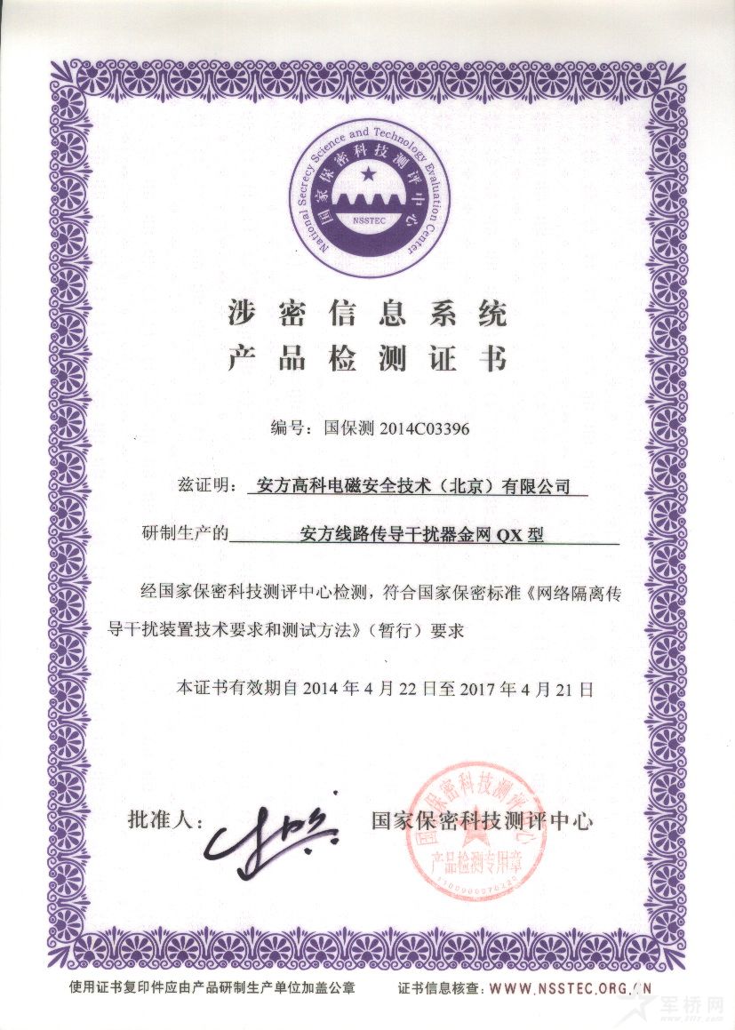 金网QX型线路传导干扰器是在网线中的一对空线上注入伪随机宽带扫频干扰信号,使之能跟随网线上正常传输的信号并行传输到另一终端,窃密者若再从网线或其它与网络干线相平行的导线上窃取信息,实际上所窃得的仅是已被干扰信号充分湮没了的混合信号,从而达到了保护机密信息传输的目的。
