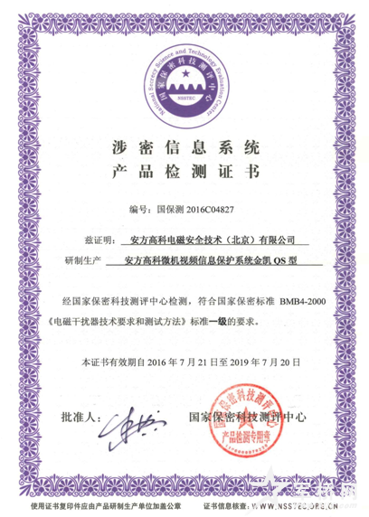 安方高科金凯QS型微机视频信息保护系统是我公司研制的最新一代针对微机视频信息进行防护的干扰专用设备,并已达到国家保密标准BMB4-2000《电磁干扰器技术要求和测试方法》一级要求。