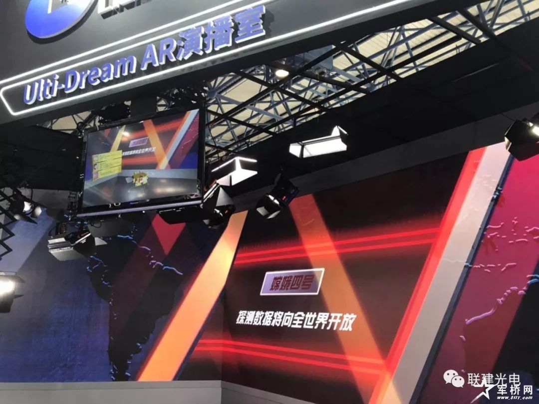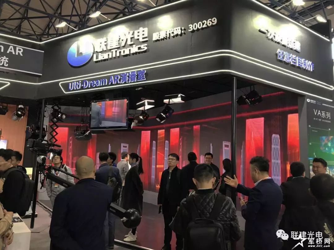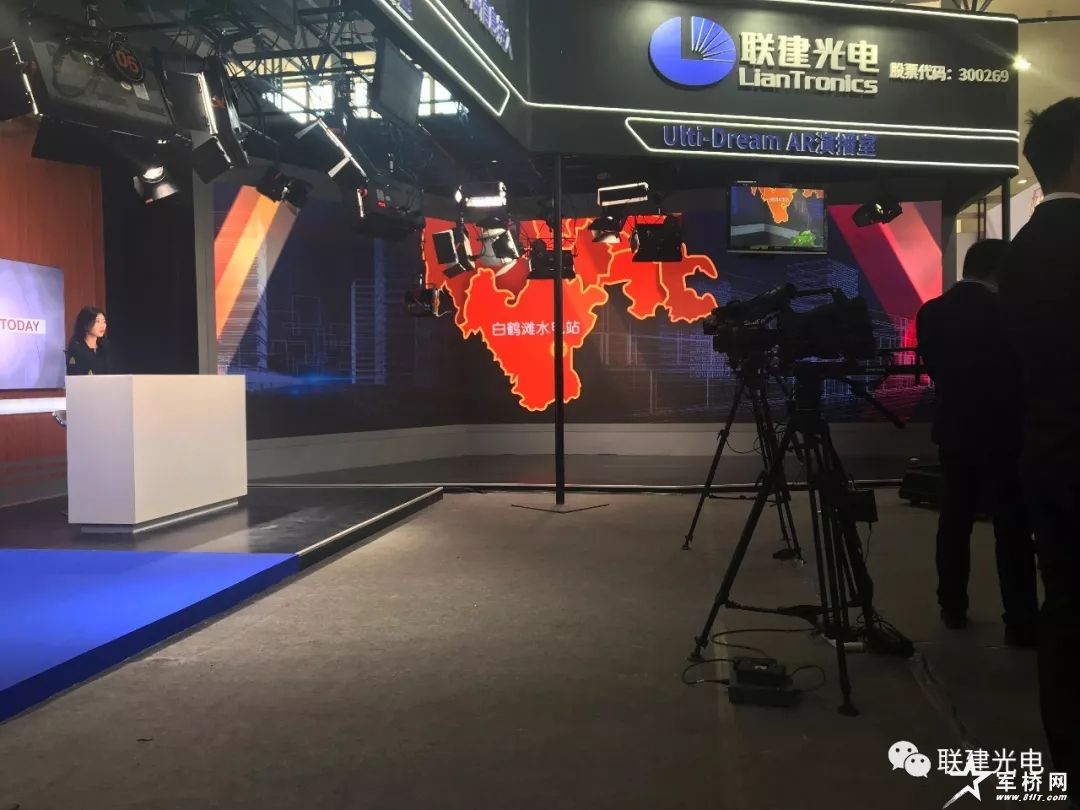 在展区的中心位置,联建光电打造的AR全景演播室十分醒目,采用广电级1.2mm小间距大屏为AR全景演播室的布景,同时结合立体显示技术、虚拟植入技术、物理跟踪技术、体感控制技术等,将画面场景中的物体用三维模型的方式呈现出来,并实时生成动画效果,每个虚拟物体都可以结合场景的需求实时做出旋转、移动、缩放、变形等动态调整,极大地丰富了场景的真实感与活泼感,打造了全新的演播概念。