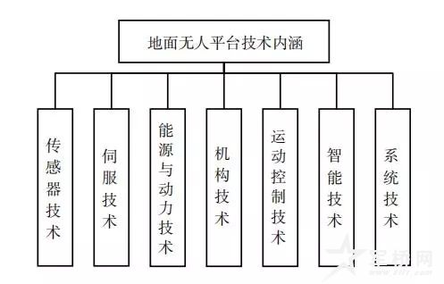 无人平台涉及到多个学科和领域的研究成果,机械、电子、自动控制、计算机、人工智能、脑科学、传感器、通讯及网络等多个学科和领域,按照专业技术体系可归纳出七项主要专业技术,包括:传感器技术、伺服技术、能源与动力技术、机构技术、运动控制技术、智能技术以及系统技术,如图2所示。