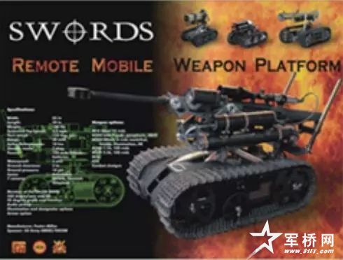 Sword军用地面平台是以Talon(魔爪)机器人作为底盘,并且加装了武器作战系统,武器系统的光瞄系统主要由4台摄像机、夜视传感器组成,能装备5.56mm口径的M249机枪,或是7.62mm口径的M240机枪,有效控制距离可以达到1km。无人平台以及直流电池为动力源,远程控制终端质量13.6kg,可以同时实现遥控武器站和平台本体控制。