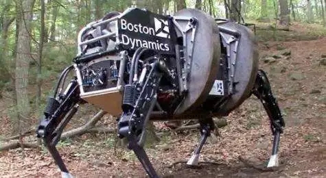 由于履带式和轮式机器人不能真正到达所要保障的士兵可能要去的每一个地方,美国国防部联合MIT和波士顿动力公司等研制的Bigdog高70cm,重约75kg,采用汽油动力,最高负载量为120磅,速度为3.3miles/h,1.5m/s内装维持机身平衡的回转仪,由本身的立体视觉系统或远程遥控器确认路径,主要用来运送军用物质。