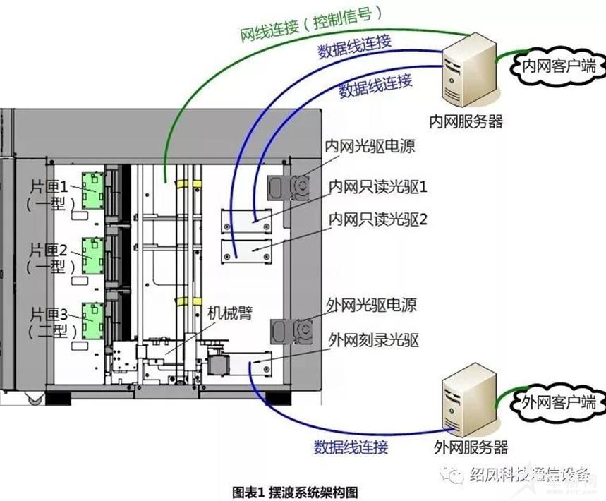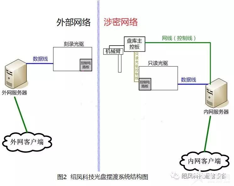 绍凤科技光盘摆渡系统由内置的外网服务器、内网服务器和光盘摆渡机组件组成。内、外网服务器通过网线可与各自网络的其他电脑互联传输数据。