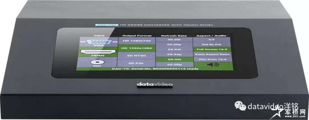 DAC-75T 触控屏多格式视频转换器是以Datavideo洋铭畅销的 DAC-70 转换器的功能为基础,结合了7英寸触控屏,用户只需浏览触摸屏上的主菜单,通过直觉式的触控操作,就可以将信号转换传送到投影机、屏幕、录像机或编码器等各种设备上,大大方便集成项目施工后,随时需要修改信号格式转换,避免破坏原装修工程,为客户提供更直观、便利的操作方式。