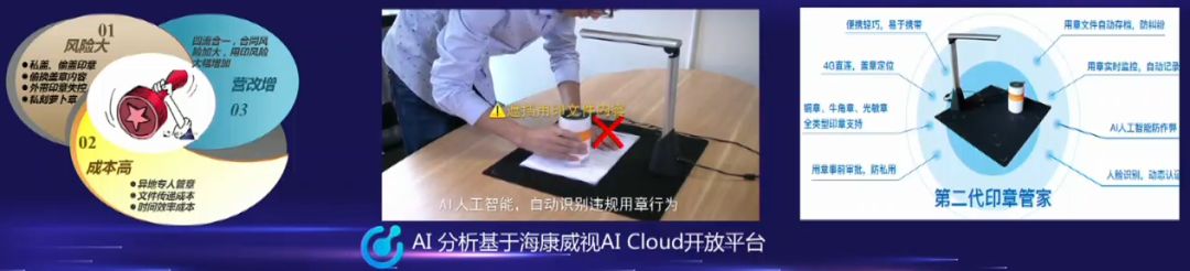 经过算法训练这个印章会进行人脸识别,判断用章的人、用印的内容和OA、ERP审核过的是否相符,防止他人滥用和内容调包。这一创新很好解决了私盖公章、公章带出去盖章时文不对题等问题,在诸多行业均有应用价值。