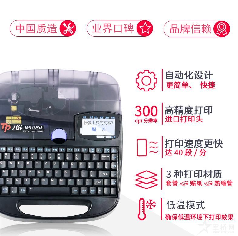 除了全新的内容编辑模式,TP76i的其他功能也是让展会观众眼前一亮。自动化设计,打印头自动压紧、自动全切、色带自动预收紧、自动清洁,简单快捷,你需要做的只是编辑好打印内容。使用进口打印头,分辨率达300DPI,同时每分钟可打印40段套管或贴纸,在高速打印的同时保证打印质量。