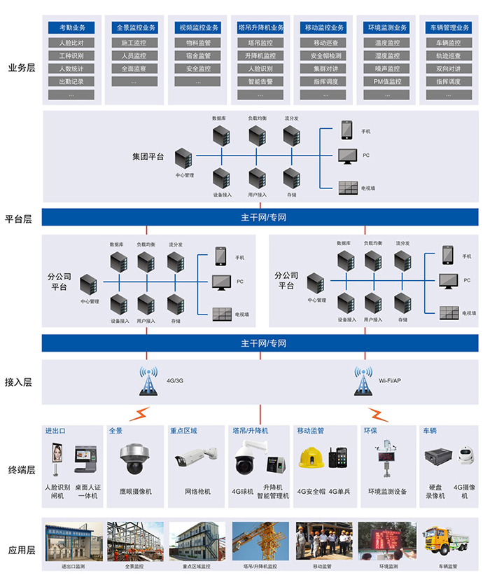 在方案设计上,有效地将4G/5G无线传输、人工智能、物联网、大数据云平台技术融合,为建筑工地管理行业提供了一整套完整的解决方案。方案囊括了当前工地管理中的考勤、全景监控、视频监控、塔吊/升降机、移动监控、环保检测、车辆管理等各分散的子系统,使得各子系统间相互联动。运用清新互联深度学习人工智能技术,在进出口、重点区域、车辆/人员移动监管、全景等场景下实时保障安全施工、文明施工和绿色施工。