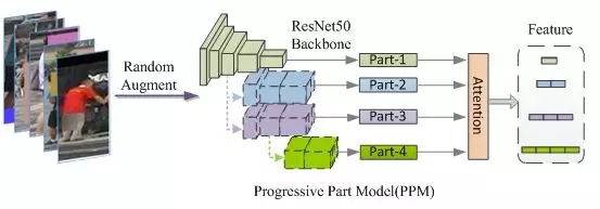 最后,在设计的PPM网络中,通过重叠采样操作促进各部件分支提取更显著的特征信息,应用改进的损失函数学习出基于球面约束的特征嵌入空间。另外,在PPM特征层加入基于Attention打分机制的分支,使网络能够自适应地从各分支中融合人体多粒度特征。