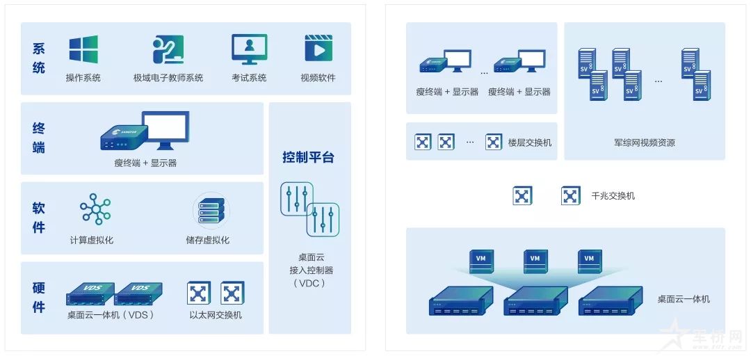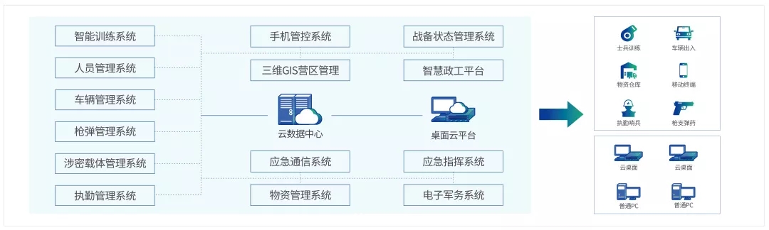 以物联网、云计算、北斗系统、下一代通信网络、高性能信息处理、智能数据挖掘等技术,在部队战备工作、军事训练、后勤保障、日常办公、营区安全、文化宣传等多方面应用。通过云桌面平台,为营区办公提供安全、稳定和易维护的办公环境;为智能训练、人员管理、车辆管理和枪弹管理等业务系统提供底层云平台,提高各业务系统的稳定性和硬件资产利用率;并通过移动终端管控系统,防止士兵通过移动终端泄密。