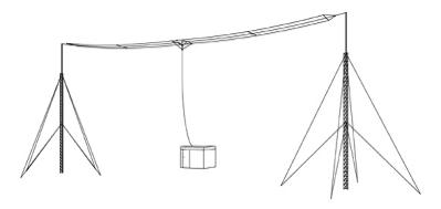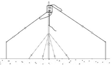 这种悬挂架设方式提供标准的3600全方位辐射,适用于中心站对不同方向分站的通信,并兼顾了水平极化液和垂直极化液,对使用水平天线的固定台和使用垂直鞭天线的车载台或背负台都有很好效果。天线长度为30米时,中央支架高15米。两则支架高2米,间距18米。
