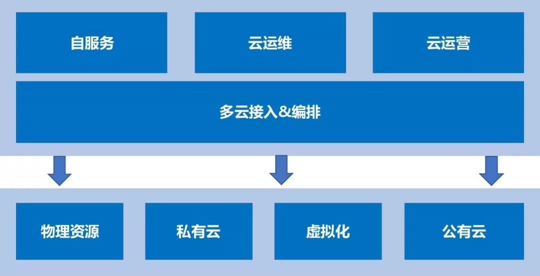 混合云平台通过多云接入和编排服务,向下连接底层各种不同资源,向上提供自服务、云管理、云服务的功能。架构如下: