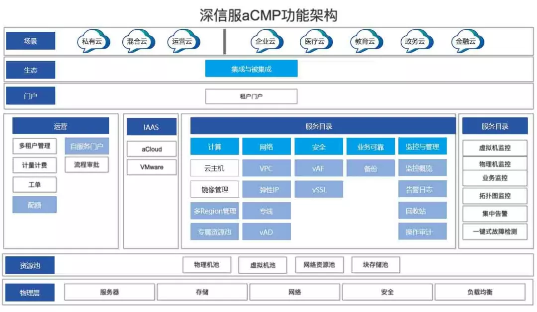 深信服混合云aCMP平台,面向企事业单位IT基础架构及数据中心的资源运维管理,提供异构下的混合云资源的生命周期管理,包括云管理、云服务、云分析。功能架构设计如下: