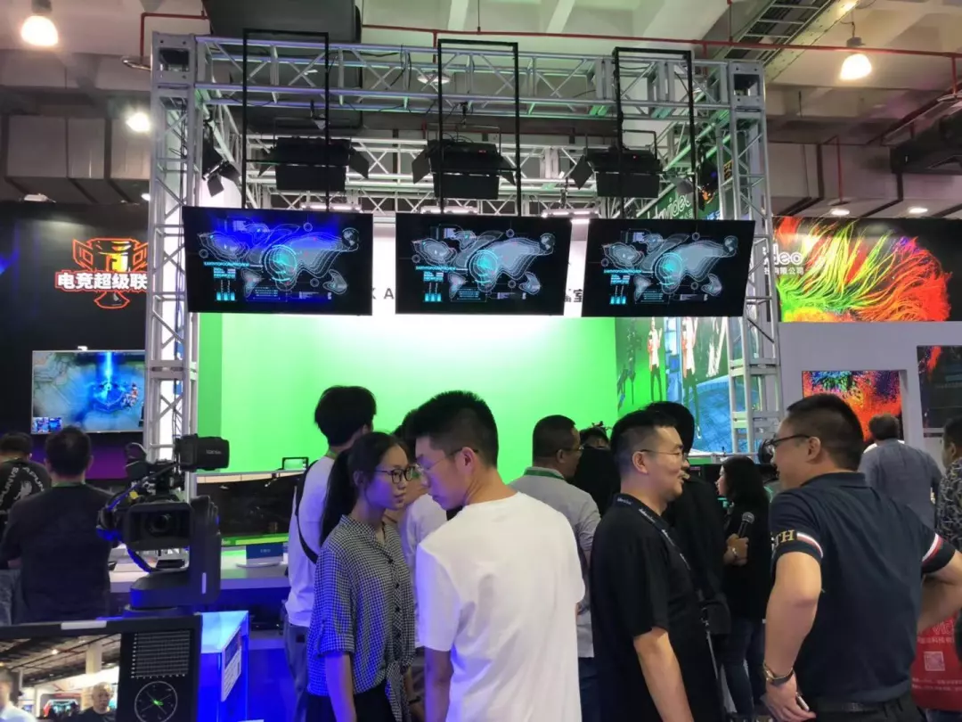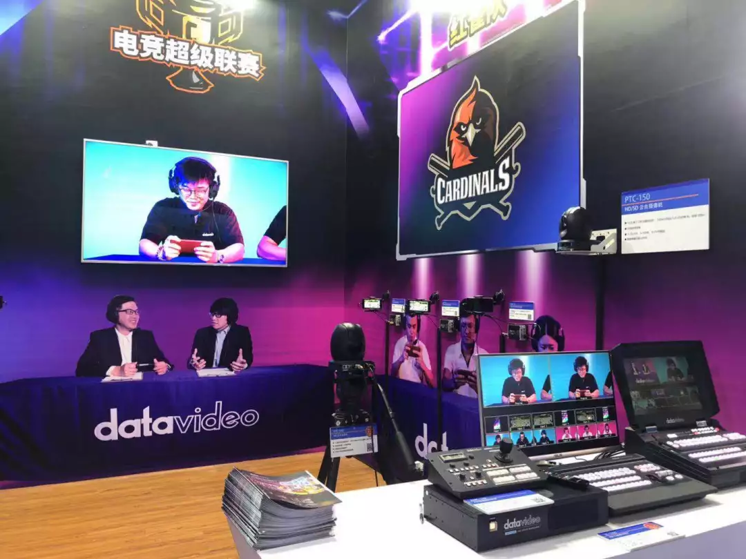 二是电竞赛事直播解决方案。在现场洋铭模拟了3V3游戏比赛,采用SE-3200+HS-3200切换台解决方案。SE-3200分别接入6路选手画面,然后输入到HS-3200,HS-3200作为主切,分别接入游戏的OB视角、现场观众视角、游机以及解说演播室视角,在加上洋铭CG-500字幕及录制,就完成了一套电竞赛事的解决方案。