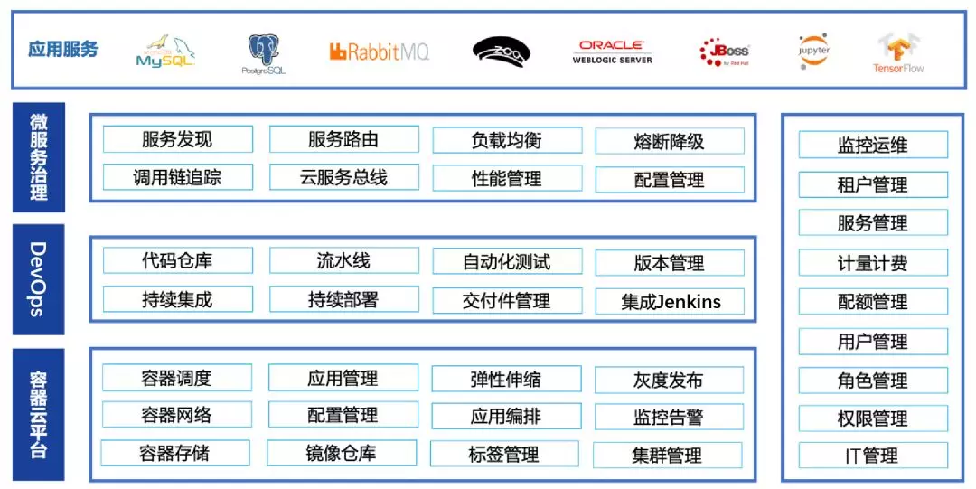 • 容器云平台:做到线上业务系统升级、发布不影响业务连续性,用户无感知;即便遇到流量突增的情况,系统也能自动快速扩容,采取限流措施,从容应对。