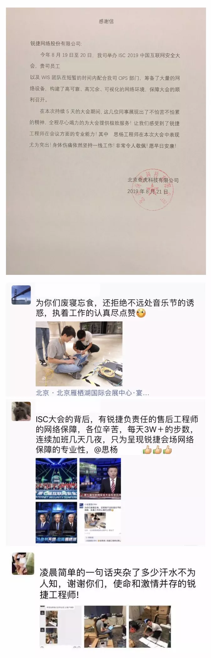 会后,奇虎360(北京奇虎科技有限公司)给MOUU发来了表扬信,点名表扬了我们这次的保障团队。客户还在朋友圈里说道:谢谢你们,使命与激情并存的MOUU工程师!
