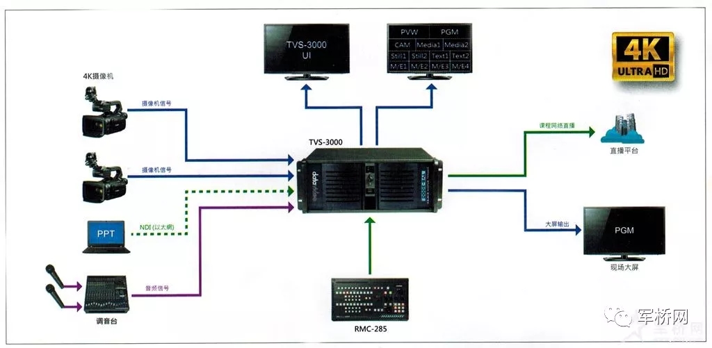 支持高达 8 路全高清、或 2 路 4K 信号的混合分辨率输入,同时支 持不限路数的多种视频格式的流媒体信号输入,与 DirectShow协议设备的信号输入,实现带切换特效的多迅道演播室。