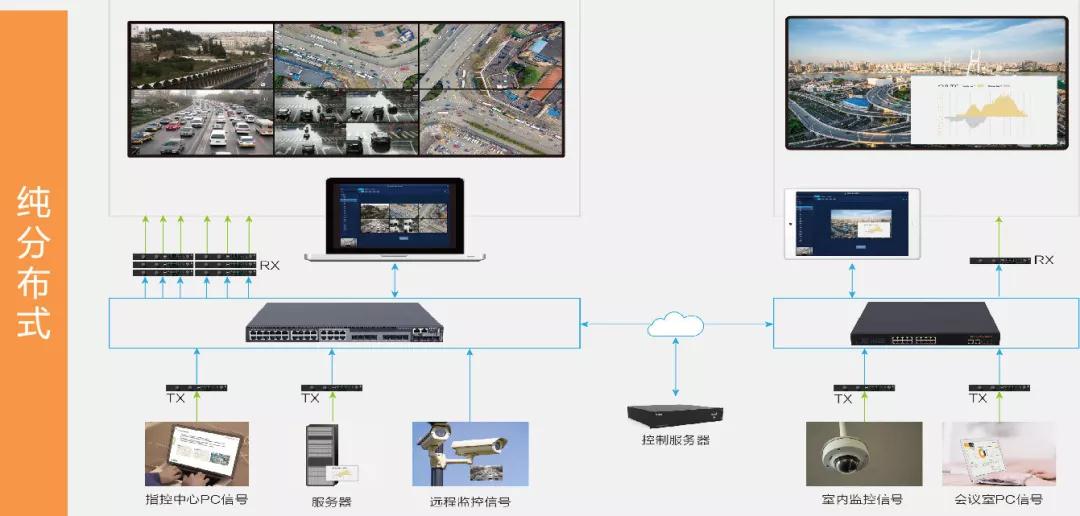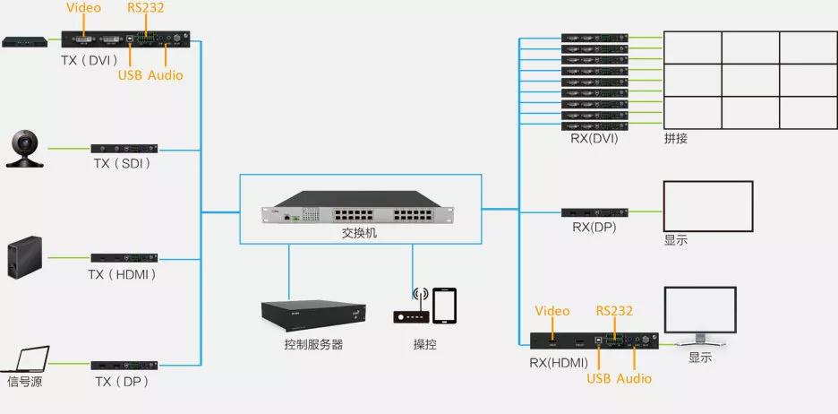 我觉得身处专业视听行业,外行经常都会问我们:做视听的主要都干点什么?主要是四个方面:传输、交换、处理、控制。这是一个典型的分布式拓扑图。左边一堆小盒子,右边一堆小盒子,中间是非常传统的交换机,下面是控制服务器和软件。从这个分享的角度来说,我认为过去各个产品在这四个环节各有各的产品,但是到了分布式,它更像一整套解决方案,同时涵盖了视频领域中这四个方面。