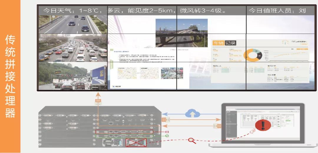 处理功能可能最常见的就是拼接部分,尤其在咱们国内市场,大屏是特别常见的显示载体。这是一个传统拼接器的图,上面展示的是普通拼接器都能满足的基本功能,开窗叠加漫游等等。集中式拼接产品,一转眼到现在已经有20年历史,我们公司的拼接器需求列表里可能有600-800项需求,经过长期开发,这些需求都变成了产品的功能模块。传统拼接器已经发展得非常完善和强大,这也是国际分布式厂商没有轻易把拼接功能加进来的原因。为什么呢?你要是做了,你就得把这些功能基本都涵盖住了,否则的话,你这个功能有,那个功能没有,因为用户以前用的时候,这些功能都有,不能变成因为现在是分布式,所以这个功能就没有,那用户就会很难受,这就对分布式厂家提出了很高的要求。比如各个屏体之间的同步性,现阶段分布式就很难解决这个问题。