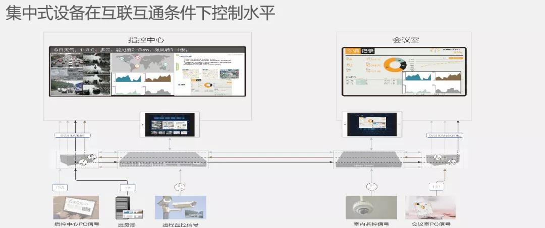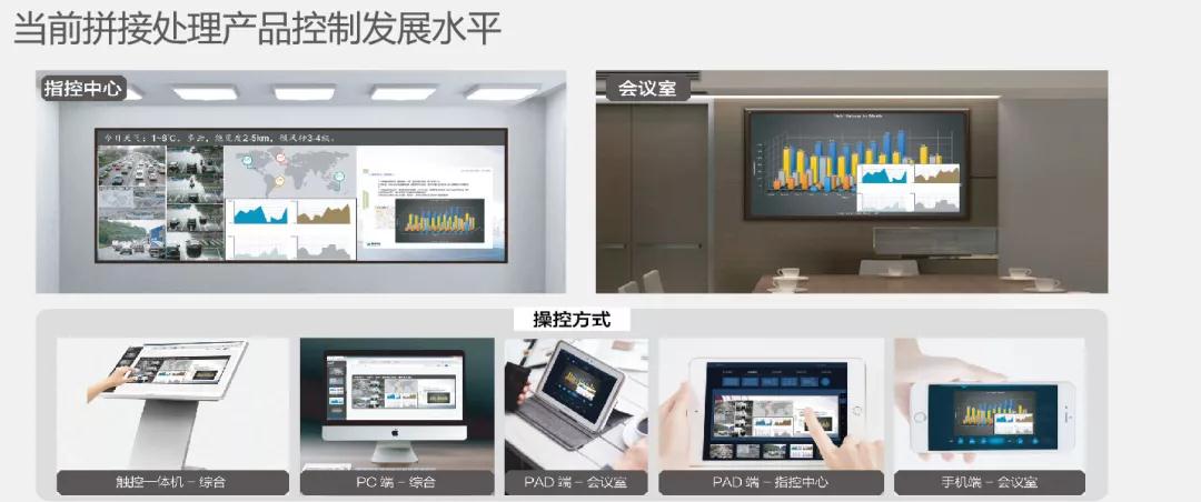 现在我们讲下当前传统产品的控制发展到一个什么层次,我们看到集中式产品也发展到可以在pc终端、落地的触屏、pad上的控制,无论会议室还是指挥中心,集中式设备的控制方式已经做到非常的复杂先进,可视化也已经达到很高的水平。所以说在这个背景下,分布式产品一旦部署项目,分布式和可视化控制都将作为一对姐妹,同时出现。因为分布式现在不是单独的产品,你很难说卖给他一个分布式之后,你再用中控去控制它,然后你又要求可视化,这对于中控是很难实现的。