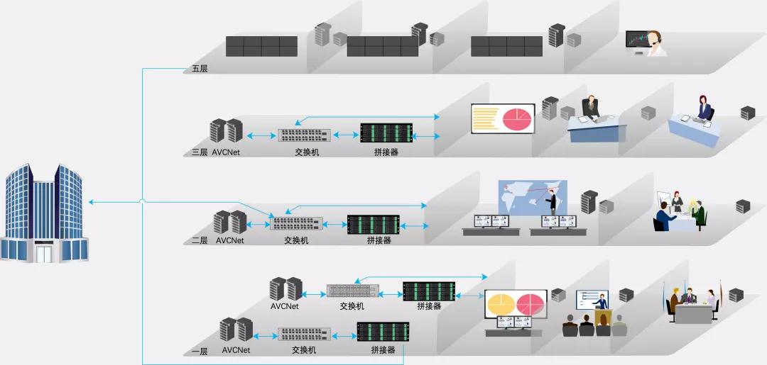 这是我们实施项目的一个简单拓扑图,我们就只提出里面的逻辑部分,不含具体数量。在该栋楼里,我们方案大概是里面最重要的部分,由大型的指挥中心、会议室、决策室、多个小会议室等组成,然后还涉及几个地下机房。这样一个复杂系统在过去部署起来非常困难,但图中项目我们去年花了不到一个月,整体架构四周便完成,后来就是小修小补。这在视频项目的实施里面,速度也算是非常快的了。为什么能这么快,而且实施完之后能做到全系统互联互通,这就是分布式带给用户的好处。在该项目实施过程中,我们明显感受到这是一个解决方案的事情,就是说我们要跟用户沟通了解到底想干什么,然后给他整体解决方案,再按照方案实施落地,最后完成用户真实的需求,这是一个闭环,而不再是做一个厂家,只给他设备。我们要跟多方密切配合,才能把这件事情做好。