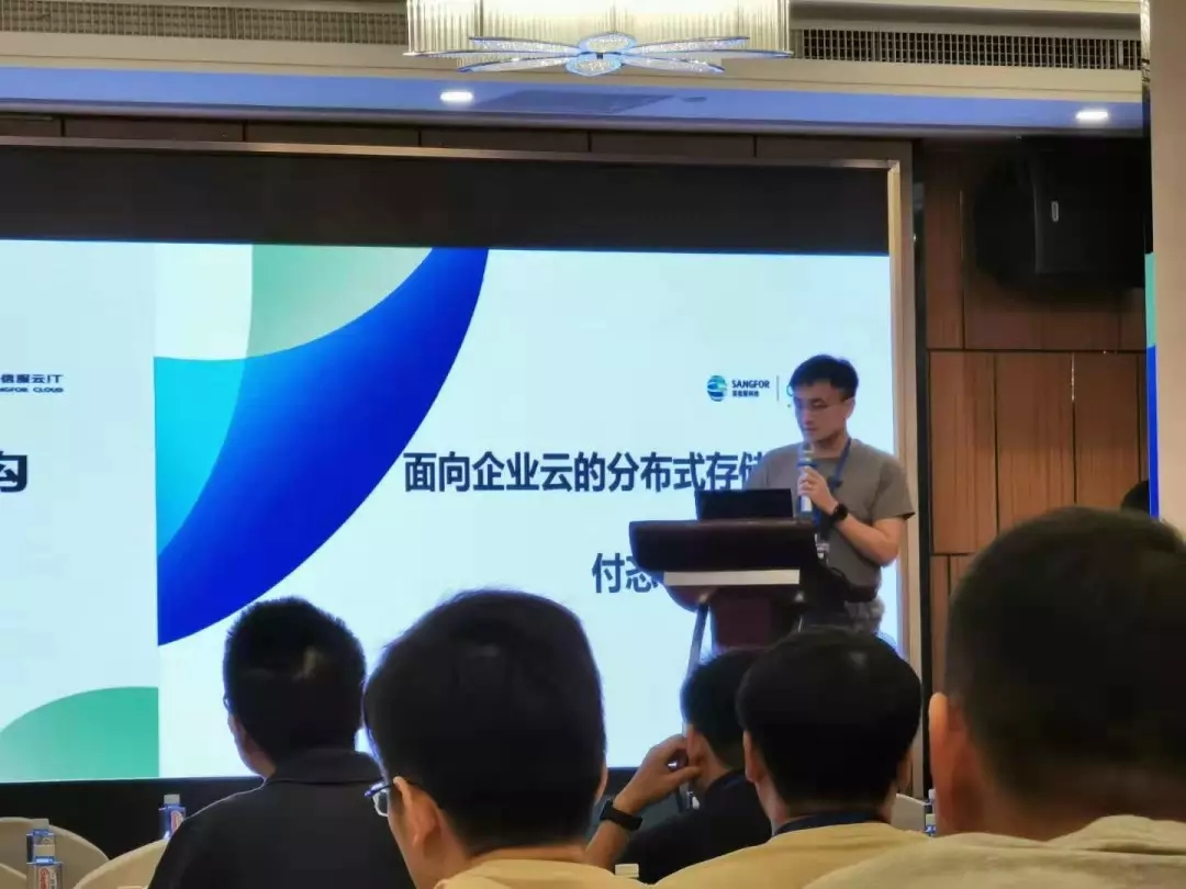 会上,深信服创新研究院存储技术专家付忞带来了《面向企业云的分布式存储架构》主题分享。秉承深信服多年存储研发积累、具备丰富实践经验的深信服企业级分布式存储EDS以其高可靠、高性能两大突出特性在本次大会备受关注。