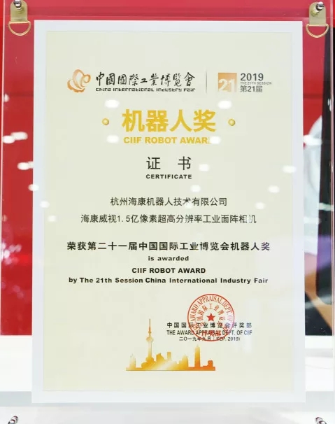 在近日揭晓的2019中国国际工业博览会(简称“中国工博会”)专业奖中,海康威视1.5亿像素超高分辨率工业面阵相机从三百余家优秀企业的申报展品中突围,再获工博会肯定,荣摘第二十一届中国国际工业博览会CIIF机器人奖。