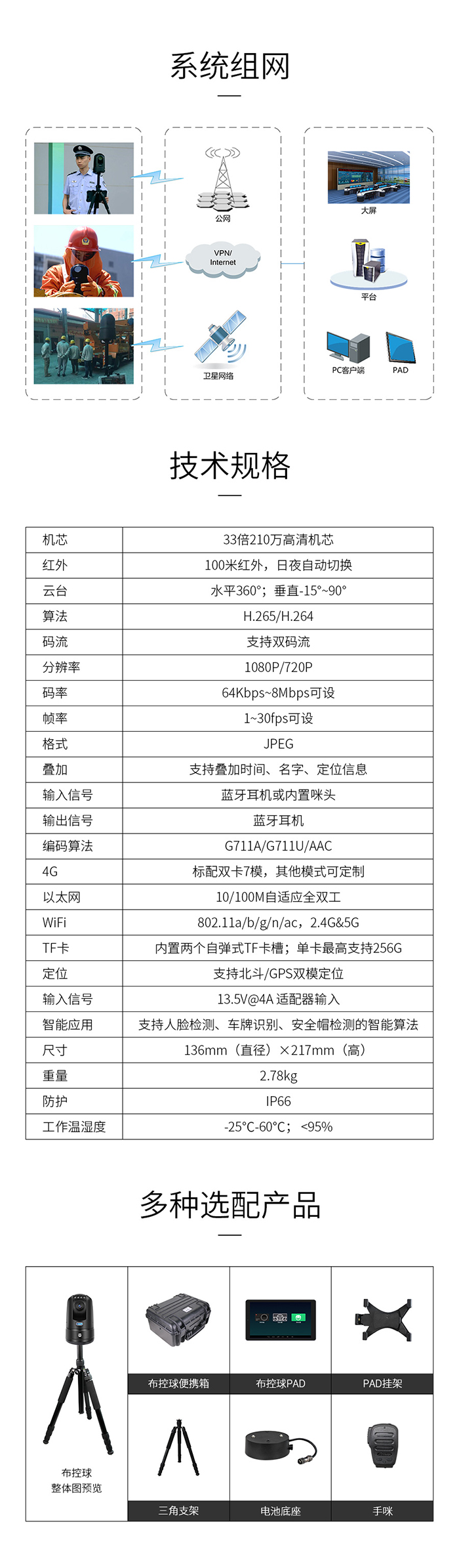 产品支持双4G/WiFi/卫星/专网无线网络传输,远程实时观看图像。33倍光学变焦镜头,视频高清流畅无卡顿。产品无需单独供电、即拆即用、携带方便,可直接摆放、吸附于车顶、置于三脚架或悬挂等。远程360°无死角云台控制,本地指挥终端可蓝牙连接操作,对现场全方位监控和远程督导。内置大容量锂电池,可持续工作8小时以上,可选配大功率锂电池座,续航达18小时。产品免安装免布线,硬件方面采用全金属内胆设计,散热效果好,稳定性高。同时新增OLED屏,随时掌握设备工作状态。
