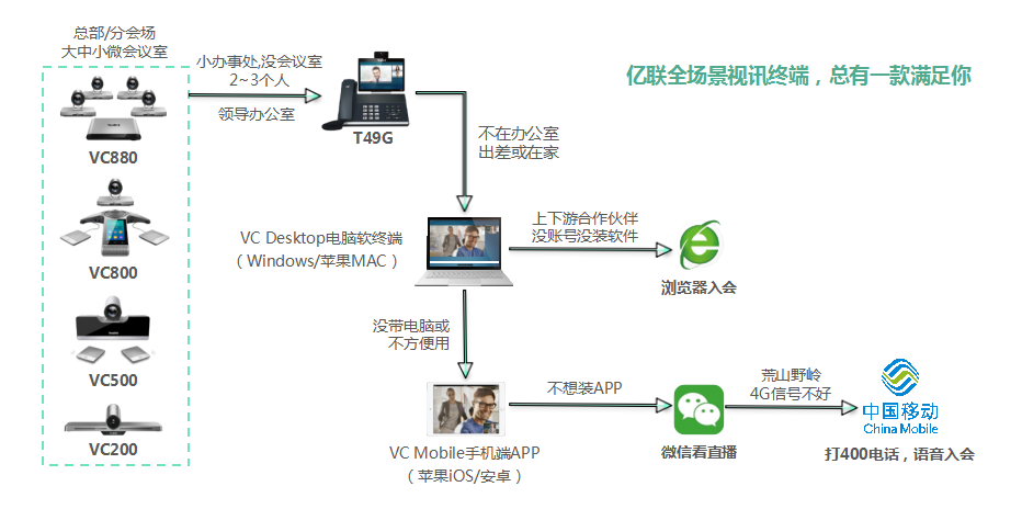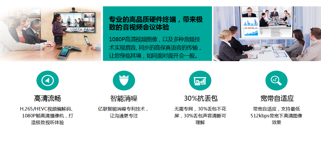 亿联云视讯是一个基于云架构的支持多方视频会议的服务平台,集云MCU、注册、穿透、会议管理、会议控制、设备管理等服务模块于一体,并支持亿联视频会议终端、桌面视频话机、PC软终端、移动APP等亿联全系列视频会议产品。