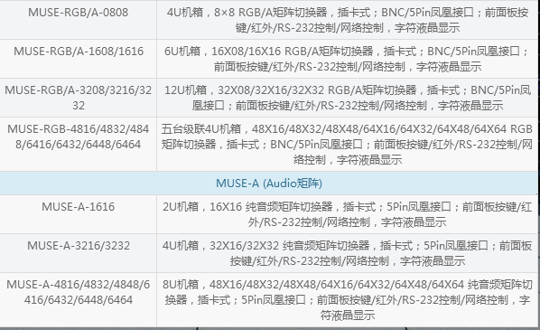Muse系列矩阵切换器是一款高性能的专业音视频信号切换设备,用于多路音视频的输入输出交叉切换,每路信号可单独切换