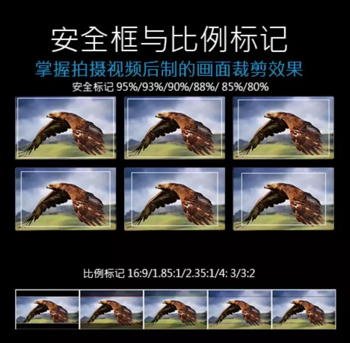 画面显示比例可调整为满屏/16:9/1.85:1/2.35:1/4:3/3:2等,可以让用户查看视频画面在不同比例监视器上的效果。安全框和比例标记,可掌握拍摄视频后制的画面裁剪效果。