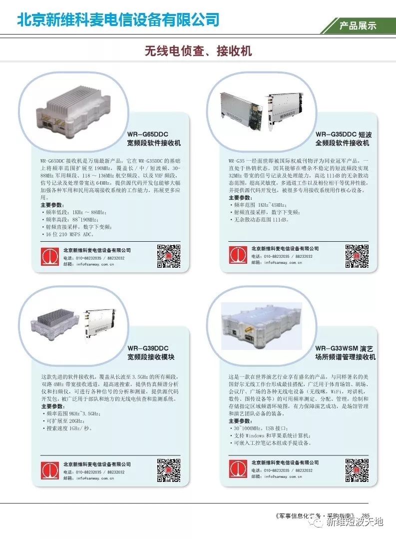 在无线电接收领域,公司长期担任澳大利亚万瑞公司(无线电接收领域前沿科技企业)的中国总代理商和技术服务中心,同时与许多科研机构协作,针对国防等高端用户的业务需求,研发专用的系统集成设备。