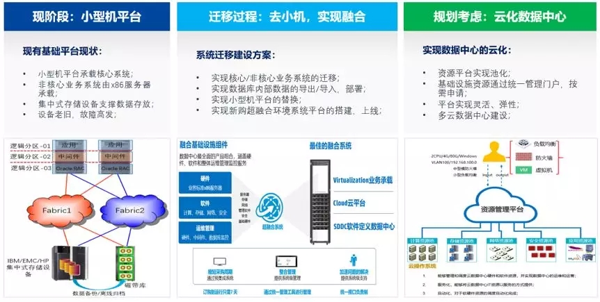 采用小型机系统搭建的传统物理架构要演进到云数据中心架构,迁移过程并非一蹴而就。在前几期的云计算大讲堂中信服君提到,在保障业务运行不受影响的情况下,迁移改造思路分为三步: