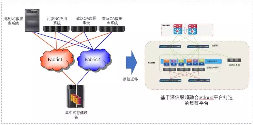 该平台采用深信服Unix to Sangfor aCloud解决方案打造,将安泰科技现有的致远OA系统、用友NC系统、Oracle数据库、Websphere中间件等核心业务系统做了集中式整合,从Power740小型机顺利地迁移到新组建的超融合aCloud集群平台中。深信服创新打造的极简、稳定、高性能的超融合aCloud架构,为用户去小型机化提供了稳定的承载运行平台。具体表现在: