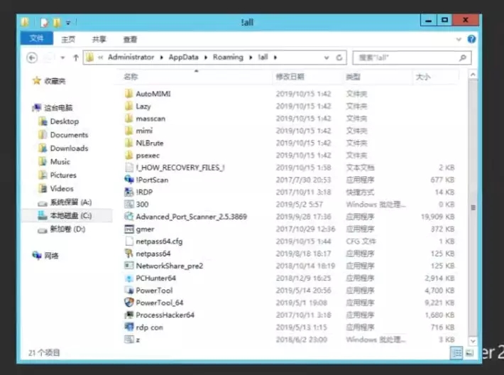 该勒索病毒主要利用全套黑客工具包对内网主机进行渗透,人工投放勒索病毒进行加密。在被勒索的主机上获取到攻击者留下的全套黑客工具包,包含从密码收集到远程登录等一系列内网渗透工具,可谓是一应俱全,其中包含较为小众的AutoMIMI、Lazy、rdp_con、gmer等工具,甚至包含名为!RDP的快捷方式,用于启动本地远程桌面连接:
