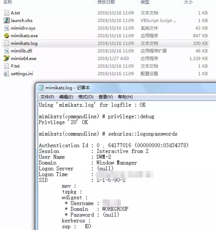 1、 本地提权后,使用mimikatz抓取主机密码,在此过程中,黑客写了自动化脚本launch.vbs来简化抓取密码的步骤。