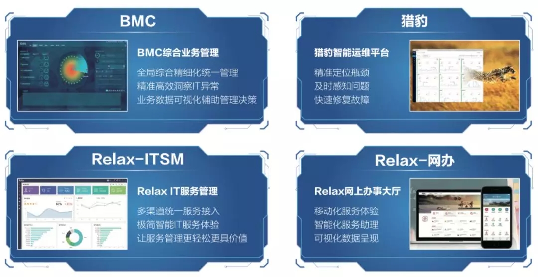 目前,RIIL家族产品主要包括:RIIL-BMC综合业务管理、RIIL-Cheetah猎豹智能运维、RIIL-Relax乐为IT服务管理与RIIL-Relax乐为网上办事大厅等解决方案。RIIL的应用场景已延伸至用户体验评估、大数据分析、自动化管理、物联网监控、政务办公效率提升等技术领域,家族产品持续丰实,为不同行业客户的不同场景,提供着特色化的IT运维解决方案。