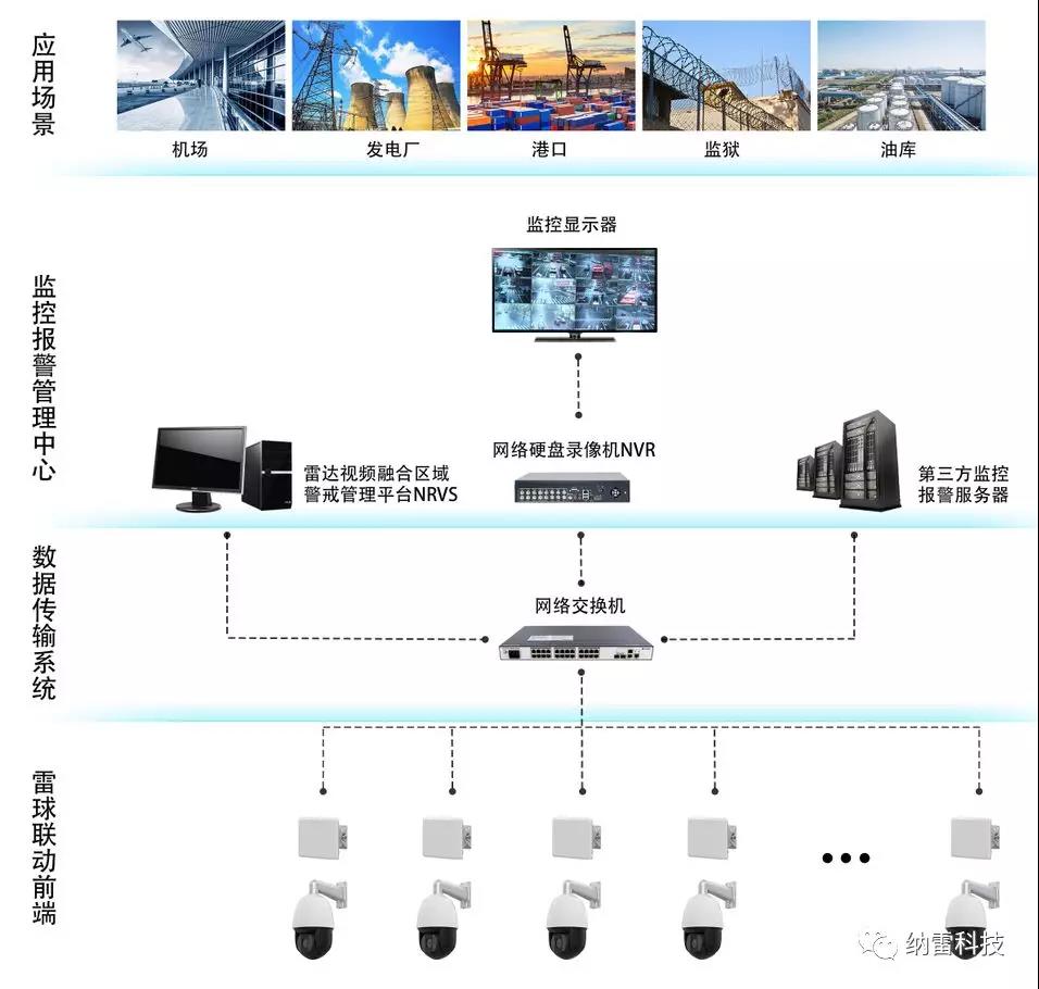 纳雷科技雷达视频融合系统纳雷科技采用毫米波雷达和视觉融合的设计理念,将高精度毫米波雷达与传统视觉系统融合使用。雷达主动进行探测,通过目标的距离、角度和速度进行精确定位并实时显示跟踪轨迹,融合视频进行目标复核,充分发挥了雷达技术的主动探测性、高灵敏度和视频的可视性。该系统还可与声、光联动应用,用声、光提示报警,实现进一步的产品方案应用。
