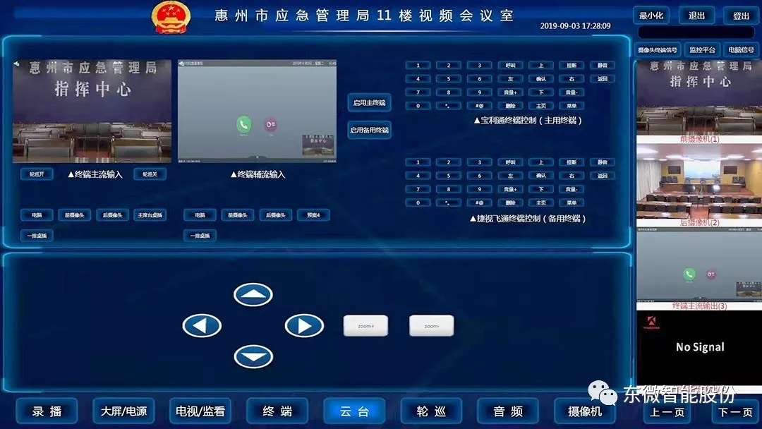 同时,整个操作流程全部都可以通过一个平台进行全线控制,彻底摆脱过去操作使用难的情况。工作人员只需要通过简单的上岗培训就可以进行无障碍操作,同时还可以通过PAD进行移动端的音视频设备操作,除此之外会议室大屏会同步高清显示目前在此操作平台接入的信号源所有画面,工作人员可以直接通过电脑端进行操作演示,真正做到了“三屏同显,三屏同控”。
