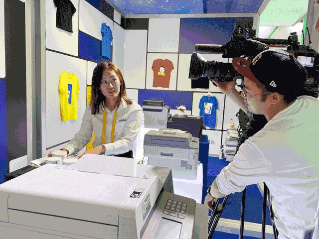 作为报道过Brother首届进博会的ICS日语频道,今年也被我们的展馆设计所吸引,来到Brother的展位进行采访。清新可爱的Candy新品,为“白T”化妆的服装数码打印机,无不吸引着摄像师的镜头。