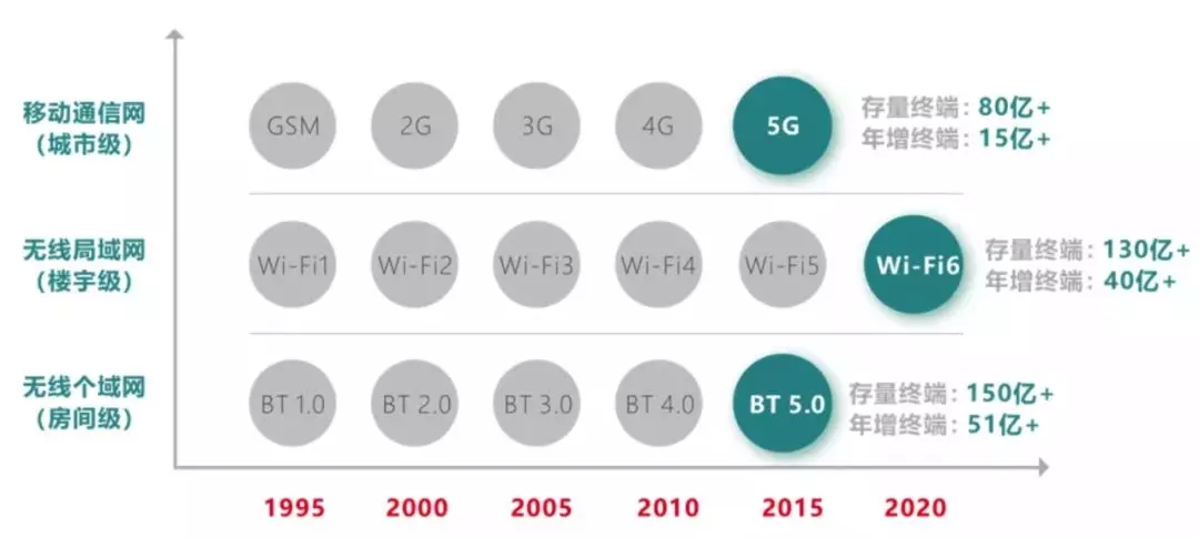 第一代无线局域网802.11b诞生于1997年,随后精力了11a、11g、11n和11ac几代标准。到2018年,Wi-Fi联盟统一成用数字代号,也就是所谓的Wi-Fi 1到Wi-Fi 6。其中Wi-Fi 6在2018年正式开始商用。Wi-Fi类的终端包括我们使用的每一部的手机、平板电脑、每部PC,还有更多智能设备,到目前全球Wi-Fi类终端存量有130亿以上,而且每年增长的终端数超过40亿。
