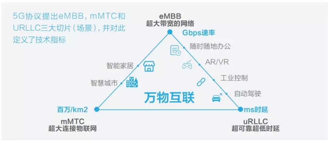 众所周知,5G技术具有三个代表性特性和应用场景:eMBB(具备超大带宽的网络)、mMTC(超大连接的物联网)和uRLLC(高可靠低时延的网络)。实际上,5G并不是一个横空出世的技术,也不算是一个突破型的技术。5G采用的一些关键技术,基本上是4G技术的提升。比如说频宽,4G频宽是20兆,而5G现在开放的频段是100兆;比如说天线,4G典型的是4发4收或者8发8收,到了5G是64发64收;另外5G通过更高的调制效率实现了更高的速率。