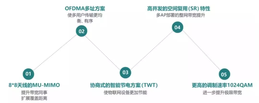 Wi-Fi 6是新一代的Wi-Fi,引入了五个关键的新技术: