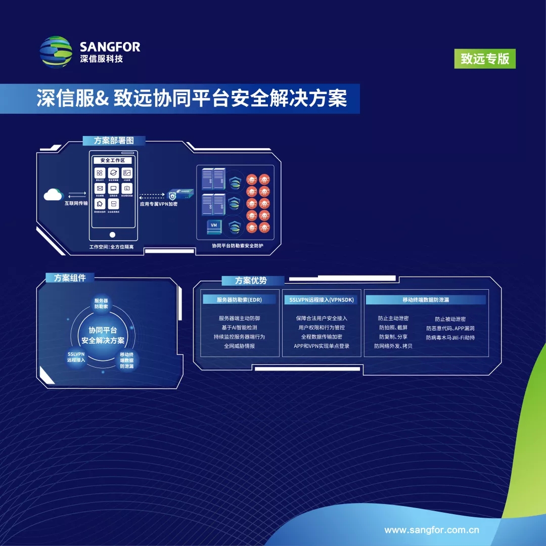 致远&深信服协同平台数据安全方案集合服务器防勒索、SSL VPN远程接入和移动终端数据防泄漏三个安全组件,并与致远协同平台进行深度适配和集成,推出致远专版的安全产品融合方案。从服务器端、链路传输端和移动终端三个维度全方位保障用户协同平台上的核心数据资产安全,通过方案可以达到以下效果: