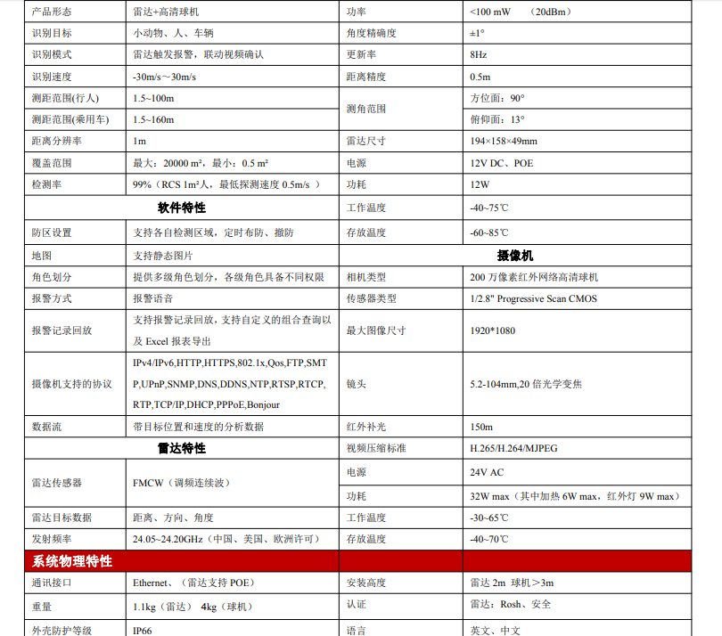 采用视频和雷达等多技术融合,打造立体防护体系,可以识别100米内,12米的各种运动目标